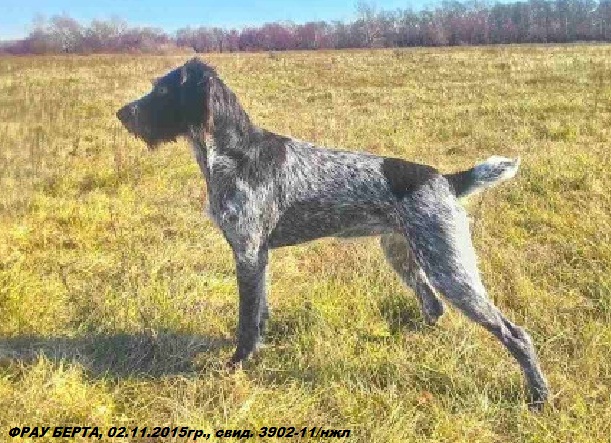 >AMBRA vom BAYERWALD, Германия DPSZ, VDH, ZB 183805, Коричнево-пегий, ZR 363/01 sg/sg H-frei VJP 75 HZP 217 VGP- ML Königsheide-Saarforst-DK |
