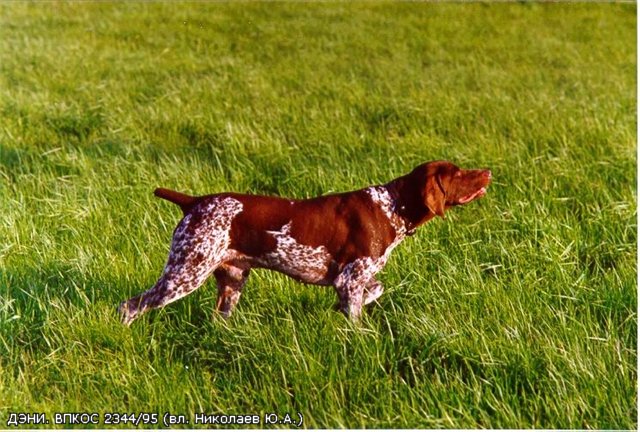 Доп. информация: Оценка собаки на выставках: Кандидат в чемпионы 105-107 Московских областных выставок 1998-2000 гг. Чемпион выставки Сабанеева 2000 г. Чемпион выставки Кубок мэра Москвы 2000 г. Чемпион Московских областных выставок 2001-2003 гг. (чемпион породы). Чемпион IX-й Всероссийской выставки охотничьих собак в г. Тамбов 2002 г. Из 20 выставок 1995-2003гг. 18 – отлично, 2-очень хорошо (младшая и средняя возрастная группа). Результаты полевых испытаний и состязаний: Победитель внутрипородных состязаний 1997 г. Призер внутрипородных состязаний 1998-2001 гг. Победитель состязаний континентальных легавых в Марково 2000 г. 34 полевых диплома: 8-II, 13- III по основным видам 2-II, 3- III по водоплавающей дичи 1-II, 3- III по кровяному следу 3- III вольерный барсук 1- III вольерный кабан Племенное использование(классные потомки) 15 – классных потомков.